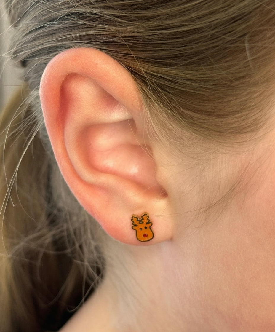 Rudolph is ready to sparkle on your ears with his shiny red nose and golden glow, bringing holiday cheer wherever you go. Made from surgical stainless steel with 18K gold plating and a secure screw‑back, these festive earrings are the perfect playful accessory for kids’ Christmas fun.